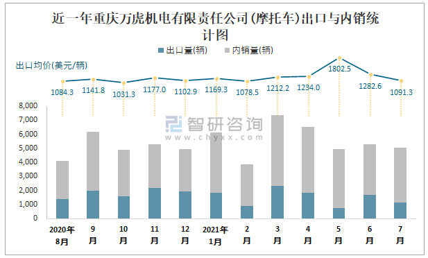 根據中國汽車工業(摩托車)產銷快訊數據統計可知:近一年重慶萬虎機電有限責任公司(摩托車)共積壓庫存591輛,其產銷率存在一定幅度波動,2月產銷率最高(105.9%),清倉庫存216輛,7月產銷率偏低(88.14%),積壓庫存678輛;近一年重慶萬虎機電有限責任公司(摩托車)出口量偏少,銷量以內銷為主,總出口量占比總銷量的30.3%,出口均價5月達到最高值,此后逐月遞減,其中7月出口量為1133輛,出口均價約為1091.26美元/輛;2021年1-7月重慶萬虎機電有限責任公司(摩托車)累計出口量為10477輛,同比增長76.83%,累計出口金額約為1297.93萬美元,同比增長100.78%。