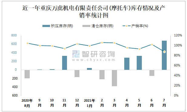 近一年重慶萬虎機電有限責任公司庫存情況及產銷率統計圖