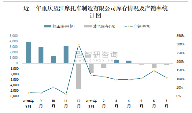 近一年重慶望江摩托車制造有限公司庫存情況及產銷率統計圖