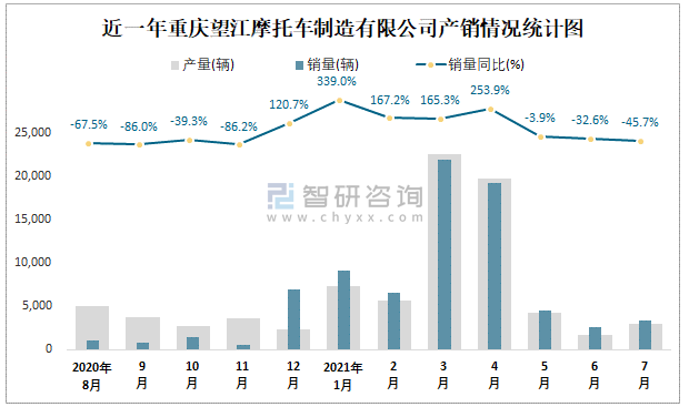 近一年重慶望江摩托車制造有限公司產銷情況統計圖