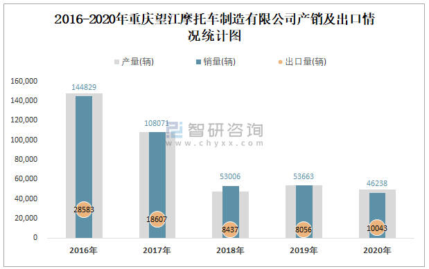 2016-2020年重慶望江摩托車制造有限公司產銷及出口情況統計圖