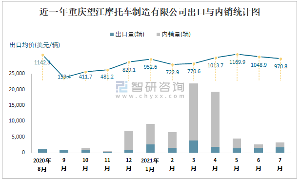 根據中國汽車工業(摩托車)產銷快訊數據統計可知:2021年7月中國摩托車產量總計為1721567輛,同比增長5.6%,銷量總計為1721887輛,同比增長4.26%,產銷率約為100.02%,清倉庫存-320輛,其中總計出口量為723084輛,內銷998803輛,出口均價約為633.62美元/輛。重慶望江摩托車制造有限公司作為重慶本土車企的摩托車企業之一,7月銷量相較于同類型車企,排名靠后,且以出口為主。