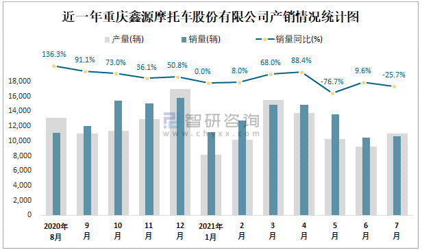近一年重慶鑫源摩托車股份有限公司產銷情況統計圖