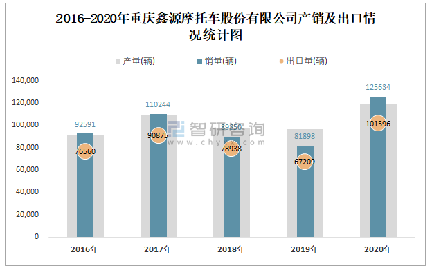 2016-2020年重慶鑫源摩托車股份有限公司產銷及出口情況統計圖