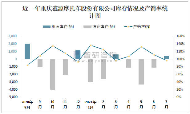 近一年重慶鑫源摩托車股份有限公司庫存情況及產銷率統計圖