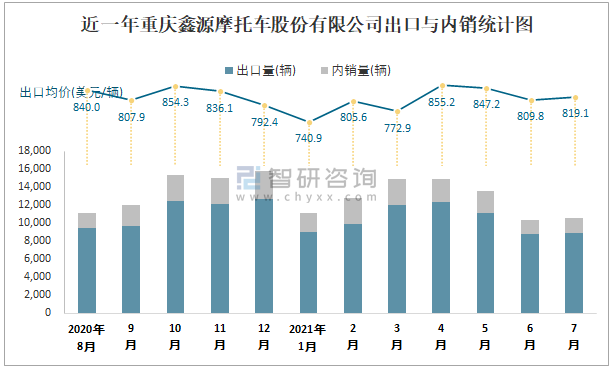 根據中國汽車工業(摩托車)產銷快訊數據統計可知:2021年7月中國摩托車產量總計為1721567輛,同比增長5.6%,銷量總計為1721887輛,同比增長4.26%,產銷率約為100.02%,清倉庫存-320輛,其中總計出口量為723084輛,內銷998803輛,出口均價約為633.62美元/輛。重慶鑫源摩托車股份有限公司作為重慶本土車企的摩托車企業之一,7月銷量相較于同類型車企,排名處于中等水平,且以出口為主。