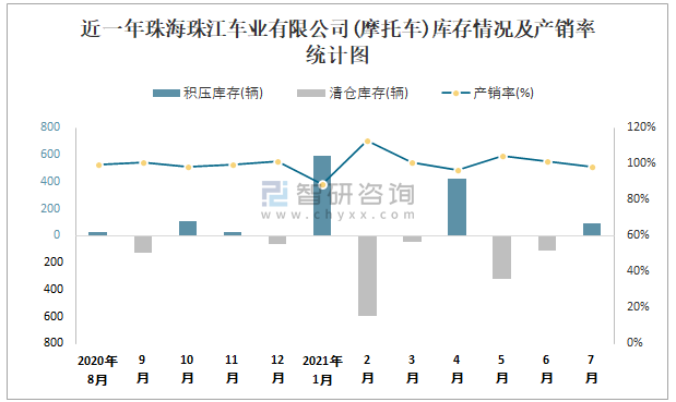 近一年珠海珠江車業(yè)有限公司庫存情況及產(chǎn)銷率統(tǒng)計圖