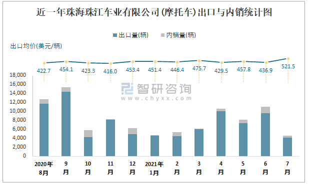 根據(jù)中國汽車工業(yè)(摩托車)產(chǎn)銷快訊數(shù)據(jù)統(tǒng)計可知:2021年7月中國摩托車產(chǎn)量總計為1721567輛,同比增長5.6%,銷量總計為1721887輛,同比增長4.26%,產(chǎn)銷率約為100.02%,清倉庫存-320輛,其中總計出口量為723084輛,內(nèi)銷998803輛,出口均價約為633.62美元/輛。珠海珠江車業(yè)有限公司作為臺港澳與境內(nèi)合資的摩托車企業(yè)之一,7月銷量相較于同類型車企,排名第5,且以出口為主。