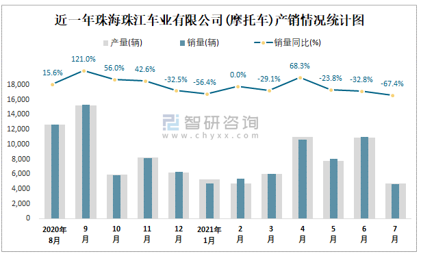根據(jù)中國汽車工業(yè)(摩托車)產(chǎn)銷快訊數(shù)據(jù)顯示:2021年7月珠海珠江車業(yè)有限公司(摩托車)產(chǎn)量為4700輛,同比下降65.19%,銷量為4613輛,同比下降67.37%;2021年1-7月珠海珠江車業(yè)有限公司(摩托車)累計產(chǎn)量為50375輛,同比增長20.85%,累計銷量為50357輛,同比下降22.36%;2016-2020年珠海珠江車業(yè)有限公司(摩托車)產(chǎn)銷量2018年跌至最低值,此后逐年遞增,且近5年總銷量大于總產(chǎn)量,清倉庫存822輛,總體銷量以出口為主。