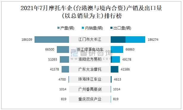 2021年7月摩托車企(臺港澳與境內(nèi)合資)產(chǎn)銷及出口量(以總銷量為主)排行榜
