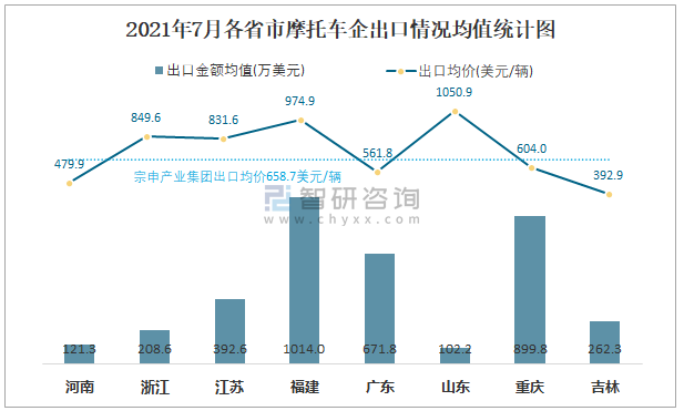 根據中國汽車工業(摩托車)產銷快訊數據統計可知:2021年7月中國摩托車產量總計為1721567輛,同比增長5.6%,銷量總計為1721887輛,同比增長4.26%,產銷率約為100.02%,清倉庫存-320輛,其中總計出口量為723084輛,內銷998803輛,出口均價約為633.62美元/輛。宗申產業集團有限公司作為重慶本土車企的摩托車企業之一,7月銷量相較于同類型車企,排名第1,且以內銷為主。