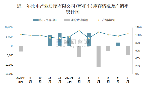 近一年宗申產業集團有限公司庫存情況及產銷率統計圖