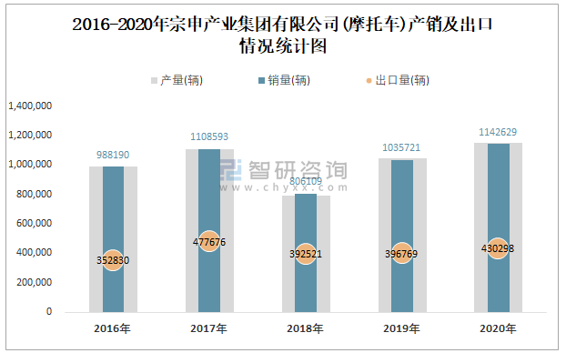 2016-2020年宗申產業集團有限公司產銷及出口情況統計圖