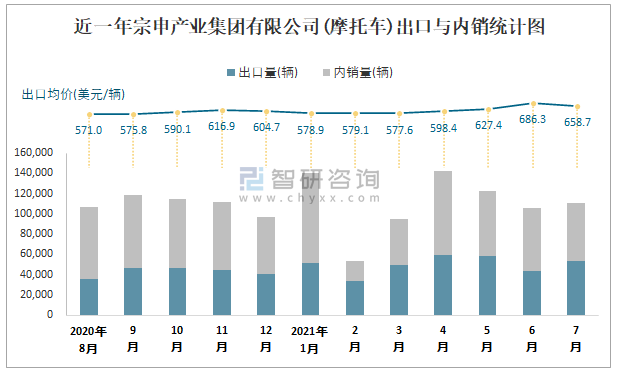 根據中國汽車工業(摩托車)產銷快訊數據統計可知:近一年宗申產業集團有限公司(摩托車)共積壓庫存1262輛,其產銷率存在一定幅度波動,2月產銷率最高(111.96%),清倉庫存5707輛,2020年12月產銷率偏低(93%),積壓庫存7285輛;近一年宗申產業集團有限公司(摩托車)出口量偏少,銷量以內銷為主,總出口量占比總銷量的42.7%,出口均價6月達到最高值,此后有所下滑,其中7月出口量為53463輛,出口均價約為658.71美元/輛;2021年1-7月宗申產業集團有限公司(摩托車)累計出口量為348730輛,同比增長61.2%,累計出口金額約為21471.9萬美元,同比增長76.91%。