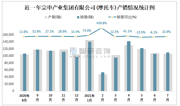 根據中國汽車工業(摩托車)產銷快訊數據顯示:2021年7月宗申產業集團有限公司(摩托車)產量為105744輛,同比增長9.68%,銷量為110331輛,同比增長15.86%;2021年1-7月宗申產業集團有限公司(摩托車)累計產量為759566輛,同比增長28.51%,累計銷量為768809輛,同比增長29.51%;2016-2020年宗申產業集團有限公司(摩托車)產銷量2018年跌至最低值,此后逐年遞增,且近5年總產量大于總銷量,積壓了庫存8575輛,出口量偏少,銷量以內銷為主。