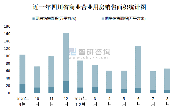 2021年8月四川省商業營業用房銷售面積為66.35萬平方米(現房銷售面積占比12.86%)
