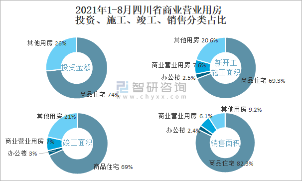 根據國家統計局數據統計可知:2021年1-8月四川省房地產開發企業在包括商業營業用房在內的其他用房投資金額占比為26.5%(注:只有投資金額中其他用房包含辦公樓、商業營業用房),商業營業用房的新開工面積與竣工面積所占比重差異不大,從銷售面積來看,商業營業用房銷售面積占比高于辦公樓銷售面積占比。