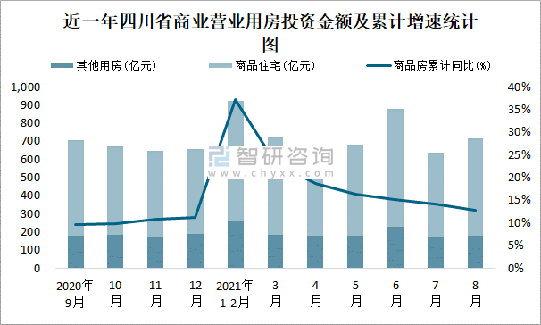 根據國家統計局數據統計可知:2021年8月四川省房地產開發投資商品房投資金額為713.89億元,其中包括辦公樓、商業營業用房等其他用房179.85億元(注:辦公樓、商業營業用房未分開統計);2021年1-8月四川省房地產開發投資包括商業營業用房在內的其他用房累計金額為1383.53億元。