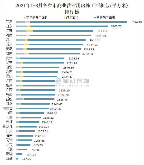 2021年1-8月各省市商業營業用房施工面積(萬平方米)排行榜