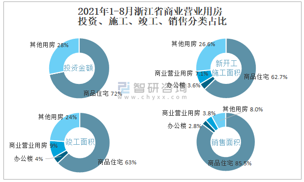 根據(jù)國(guó)家統(tǒng)計(jì)局?jǐn)?shù)據(jù)統(tǒng)計(jì)可知:2021年1-8月浙江省房地產(chǎn)開(kāi)發(fā)企業(yè)在包括商業(yè)營(yíng)業(yè)用房在內(nèi)的其他用房投資金額占比為28.2%(注:只有投資金額中其他用房包含辦公樓、商業(yè)營(yíng)業(yè)用房),商業(yè)營(yíng)業(yè)用房的新開(kāi)工面積與竣工面積所占比重差異不大,從銷售面積來(lái)看,商業(yè)營(yíng)業(yè)用房銷售面積占比高于辦公樓銷售面積占比。