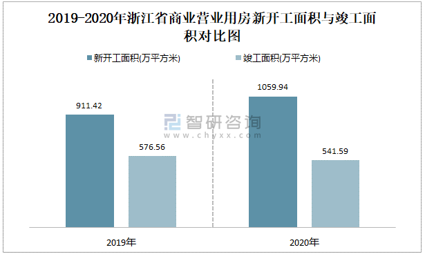 2019-2020年浙江省商業(yè)營(yíng)業(yè)用房新開(kāi)工面積與竣工面積對(duì)比圖