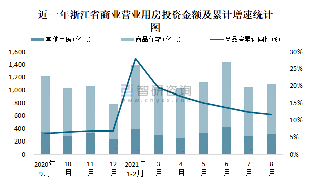 根據(jù)國(guó)家統(tǒng)計(jì)局?jǐn)?shù)據(jù)統(tǒng)計(jì)可知:2021年8月浙江省房地產(chǎn)開(kāi)發(fā)投資商品房投資金額為1093.43億元,其中包括辦公樓、商業(yè)營(yíng)業(yè)用房等其他用房314.54億元(注:辦公樓、商業(yè)營(yíng)業(yè)用房未分開(kāi)統(tǒng)計(jì));2021年1-8月浙江省房地產(chǎn)開(kāi)發(fā)投資包括商業(yè)營(yíng)業(yè)用房在內(nèi)的其他用房累計(jì)金額為2308.05億元。