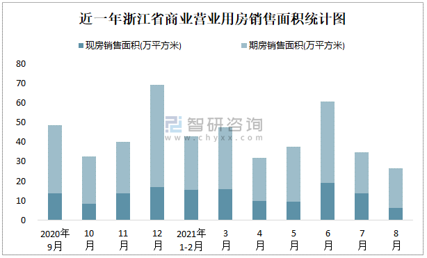 根據(jù)國(guó)家統(tǒng)計(jì)局?jǐn)?shù)據(jù)可知:2021年8月浙江省商業(yè)營(yíng)業(yè)用房銷售面積為26.51萬(wàn)平方米(其中銷售現(xiàn)房6.09萬(wàn)平方米,期房20.42萬(wàn)平方米);2021年1-8月浙江省商業(yè)營(yíng)業(yè)用房累計(jì)銷售面積為281.96萬(wàn)平方米;近一年浙江省商業(yè)營(yíng)業(yè)用房期房銷售面積遠(yuǎn)高于現(xiàn)房銷售面積。