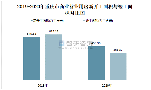 2019-2020年重慶市商業(yè)營業(yè)用房新開工面積與竣工面積對比圖