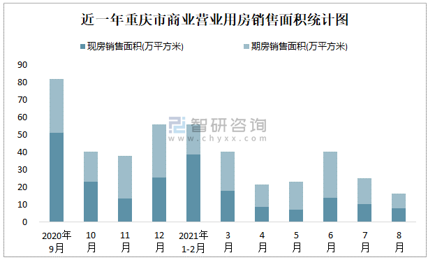 2021年8月重慶市商業(yè)營業(yè)用房銷售面積為16.32萬平方米(現(xiàn)房銷售面積占比47.86%)