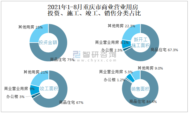 根據(jù)國家統(tǒng)計局數(shù)據(jù)統(tǒng)計可知:2021年1-8月重慶市房地產(chǎn)開發(fā)企業(yè)在包括商業(yè)營業(yè)用房在內(nèi)的其他用房投資金額占比為24.9%(注:只有投資金額中其他用房包含辦公樓、商業(yè)營業(yè)用房),商業(yè)營業(yè)用房的新開工面積與竣工面積所占比重差異不大,從銷售面積來看,商業(yè)營業(yè)用房銷售面積占比高于辦公樓銷售面積占比。