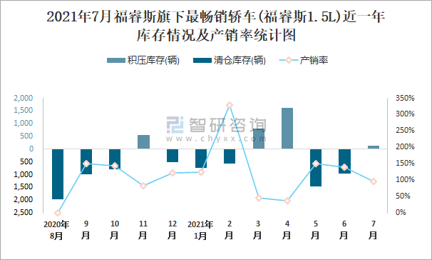 2021年7月福睿斯旗下最暢銷車(福睿斯1.5L)近一年庫存情況及產(chǎn)銷率統(tǒng)計圖