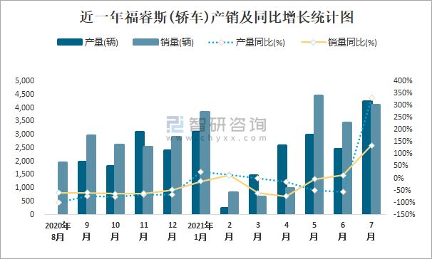 根據(jù)中國汽車工業(yè)協(xié)會數(shù)據(jù)可知:2021年7月福睿斯(轎車)產(chǎn)量為4246輛,同比增長330.6%,銷量為4104輛,同比增長135.9%,當月產(chǎn)銷率為96.66%;2021年1-7月福睿斯(轎車)累計產(chǎn)量為17121輛,同比下降7.1%,累計銷量為18312輛,同比下降8.7%,累計產(chǎn)銷率為106.96%;2014-2020年福睿斯(轎車)產(chǎn)銷量均在2016年達到最高值,此后逐年遞減,且近7年總產(chǎn)量大于總銷量,積壓了庫存1302輛。