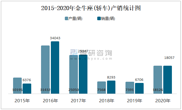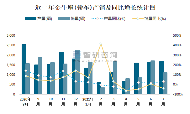 根據中國汽車工業協會數據可知:2021年7月金牛座(轎車)產量為1686輛,同比增長34.8%,銷量為1114輛,同比下降36%,當月產銷率為66.07%;2021年1-7月金牛座(轎車)累計產量為8720輛,同比增長1.4%,累計銷量為8181輛,同比下降11%,累計產銷率為93.82%;2015-2020年金牛座(轎車)產銷量2019年起呈現上升趨勢,且近6年總產量大于總銷量,積壓了庫存940輛。