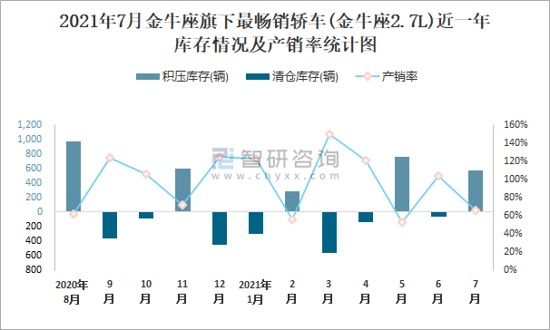 2021年7月金牛座旗下最暢銷車(金牛座2.7L)近一年庫存情況及產銷率統計圖