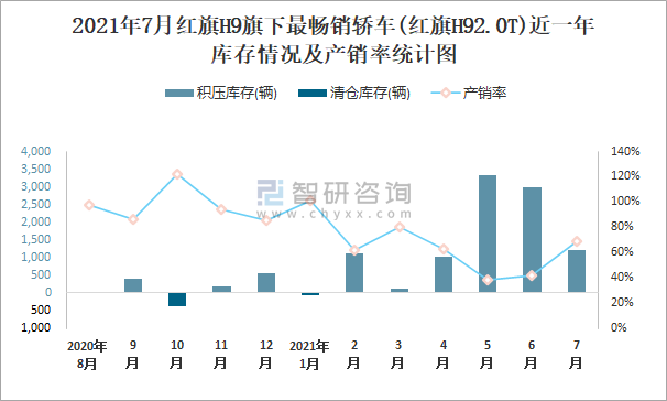 2021年7月紅旗H9旗下最暢銷車(紅旗H92.0T)近一年庫(kù)存情況及產(chǎn)銷率統(tǒng)計(jì)圖