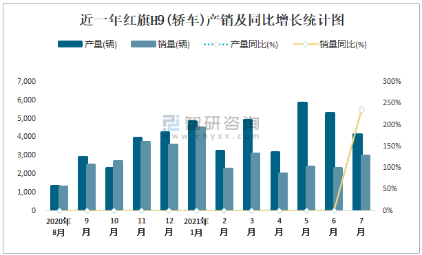 根據(jù)中國(guó)汽車工業(yè)協(xié)會(huì)數(shù)據(jù)可知:2021年7月紅旗H9(轎車)產(chǎn)量為4162輛,同比增長(zhǎng)238.4%,銷量為2981輛,同比增長(zhǎng)233.8%,當(dāng)月產(chǎn)銷率為71.62%;2021年1-7月紅旗H9(轎車)累計(jì)產(chǎn)量為31523輛,同比下降0%,累計(jì)銷量為19593輛,同比下降0%,累計(jì)產(chǎn)銷率為62.15%;且2020年紅旗H9(轎車)產(chǎn)銷量總體呈現(xiàn)下降趨勢(shì),且近1年總產(chǎn)量大于總銷量,積壓了庫(kù)存1293輛。