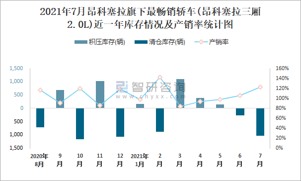 2021年7月昂科塞拉旗下最暢銷車(昂科塞拉三廂2.0L)近一年庫(kù)存情況及產(chǎn)銷率統(tǒng)計(jì)圖