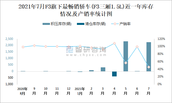 根據(jù)中國汽車工業(yè)協(xié)會(huì)數(shù)據(jù)統(tǒng)計(jì)可知:2021年7月F3(轎車)旗下只有1款F3三廂1.5L轎車在銷售;近一年F3三廂1.5L共積壓庫存4561輛,其產(chǎn)銷率存在一定幅度波動(dòng),2021年4月產(chǎn)銷率最高(108.18%),清倉庫存383輛,2021年7月產(chǎn)銷率偏低(45.47%),積壓庫存2249輛。