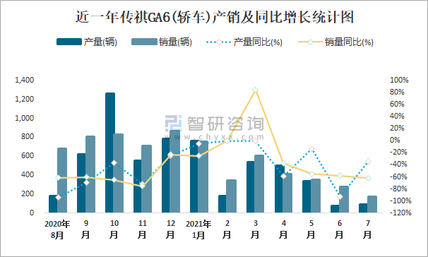 根據(jù)中國(guó)汽車(chē)工業(yè)協(xié)會(huì)數(shù)據(jù)可知:2021年7月傳祺GA6(轎車(chē))產(chǎn)量為92輛,同比下降33.8%,銷(xiāo)量為173輛,同比下降62.3%,當(dāng)月產(chǎn)銷(xiāo)率為188.04%;2021年1-7月傳祺GA6(轎車(chē))累計(jì)產(chǎn)量為2491輛,同比下降30.2%,累計(jì)銷(xiāo)量為2917輛,同比下降25.2%,累計(jì)產(chǎn)銷(xiāo)率為117.1%;2014-2020年傳祺GA6(轎車(chē))產(chǎn)銷(xiāo)量均在2017年達(dá)到最高值,此后總體呈現(xiàn)下降趨勢(shì),且近7年總產(chǎn)量大于總銷(xiāo)量,積壓了庫(kù)存416輛。