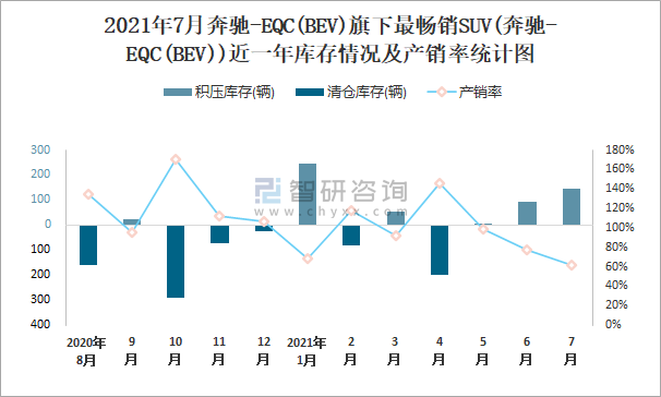 2021年7月奔馳-EQC(BEV)旗下最暢銷SUV(奔馳-EQC(BEV))近一年庫存情況及產(chǎn)銷率統(tǒng)計圖