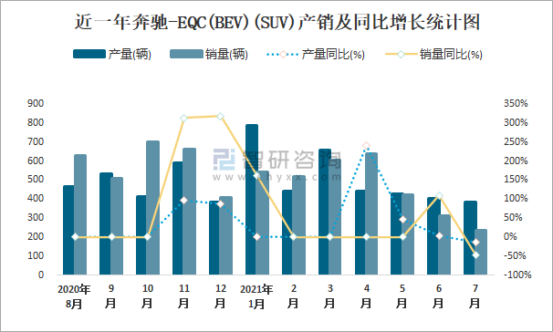 近一年奔馳-EQC(BEV)(SUV)產(chǎn)銷及同比增長統(tǒng)計圖