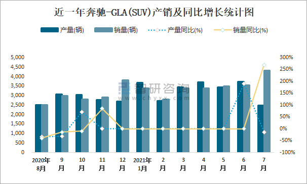 2021年7月奔馳-GLA(SUV)產銷量分別為2477輛和4323輛 當月產銷率為174.53%