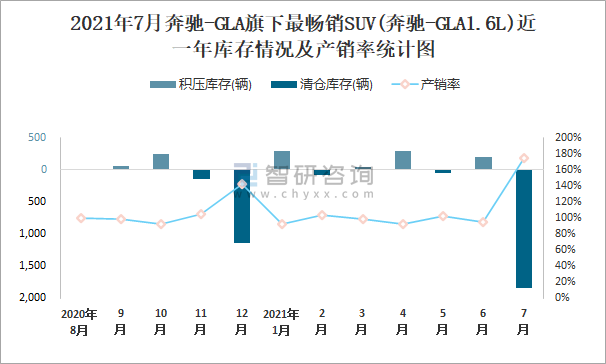 2021年7月奔馳-GLA旗下最暢銷SUV(奔馳-GLA1.6L)近一年庫存情況及產銷率統計圖