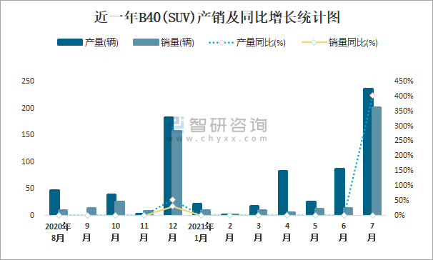 根據中國汽車工業協會數據統計可知:2021年7月B40(SUV)旗下只有1款B402.4SUV在銷售;近一年B402.4共積壓庫存2968輛,其產銷率存在一定幅度波動,2020年11月產銷率最高(266.67%),清倉庫存532輛,2020年8月產銷率偏低(1.46%),積壓庫存1352輛。