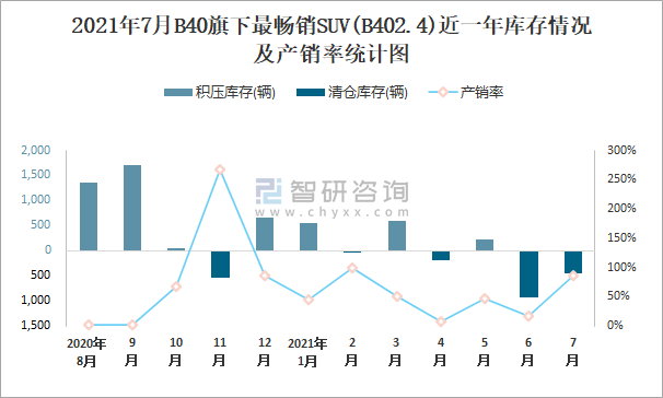 2021年7月B40旗下最暢銷SUV(B402.4)近一年庫存情況及產銷率統計圖