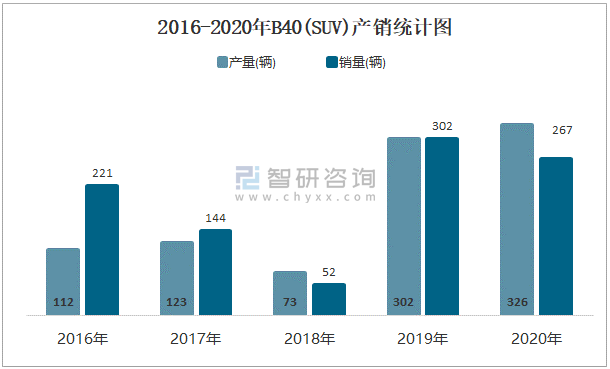 根據中國汽車工業協會數據可知:2021年7月B40(SUV)產量為236輛,同比增長402.1%,銷量為201輛,同比下降0%,當月產銷率為85.17%;2021年1-7月B40(SUV)累計產量為474輛,同比下降0%,累計銷量為254輛,同比增長398%,累計產銷率為53.59%;2016-2020年B40(SUV)產銷量均在2018年跌至最低值,此后有所增長,且近5年總銷量大于總產量,清倉庫存50輛。