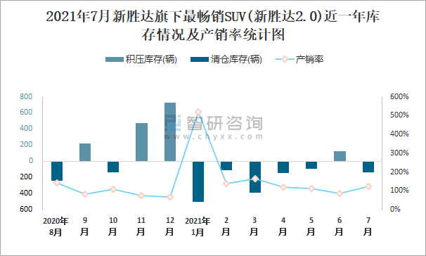 2021年7月新勝達旗下最暢銷SUV(新勝達2.0)近一年庫存情況及產銷率統計圖