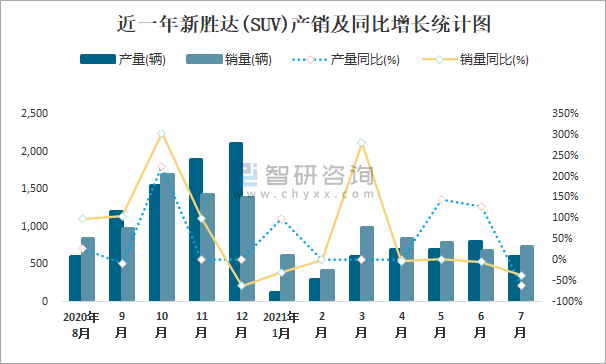 近一年新勝達(SUV)產銷及同比增長統計圖