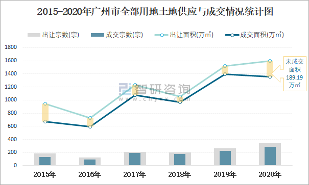 2015-2020年廣州市全部用地土地供應與成交情況統計圖