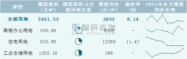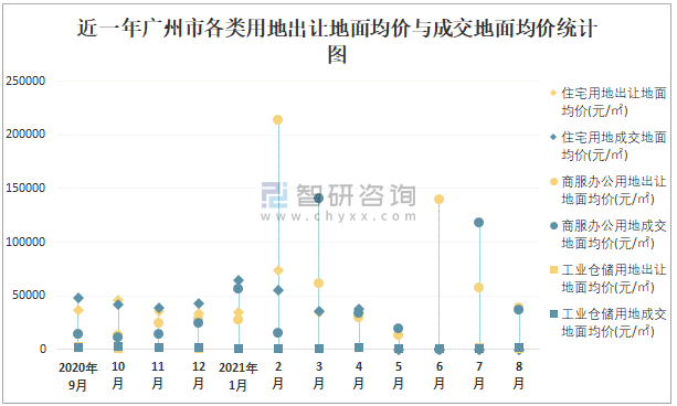 根據國信房地產信息網數據統計可知:2021年8月廣州市全部用地出讓地面均價為5093元/㎡,其中商服辦公用地出讓地面均價最高(38430元/㎡),全部用地成交地面均價為5477元/㎡;2021年1-8月廣州市工業倉儲用地樓面面積占其全部用地比重最多,為49.56%,樓面均價為368元/㎡。